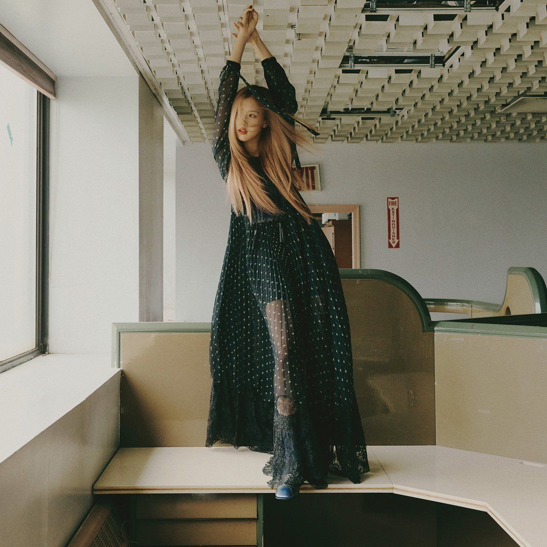 그녀는 순정만화에 나오는 것처럼 보이는 날씬하고, 날씬한 몸매를 가진 케이팝 아이돌입니다.